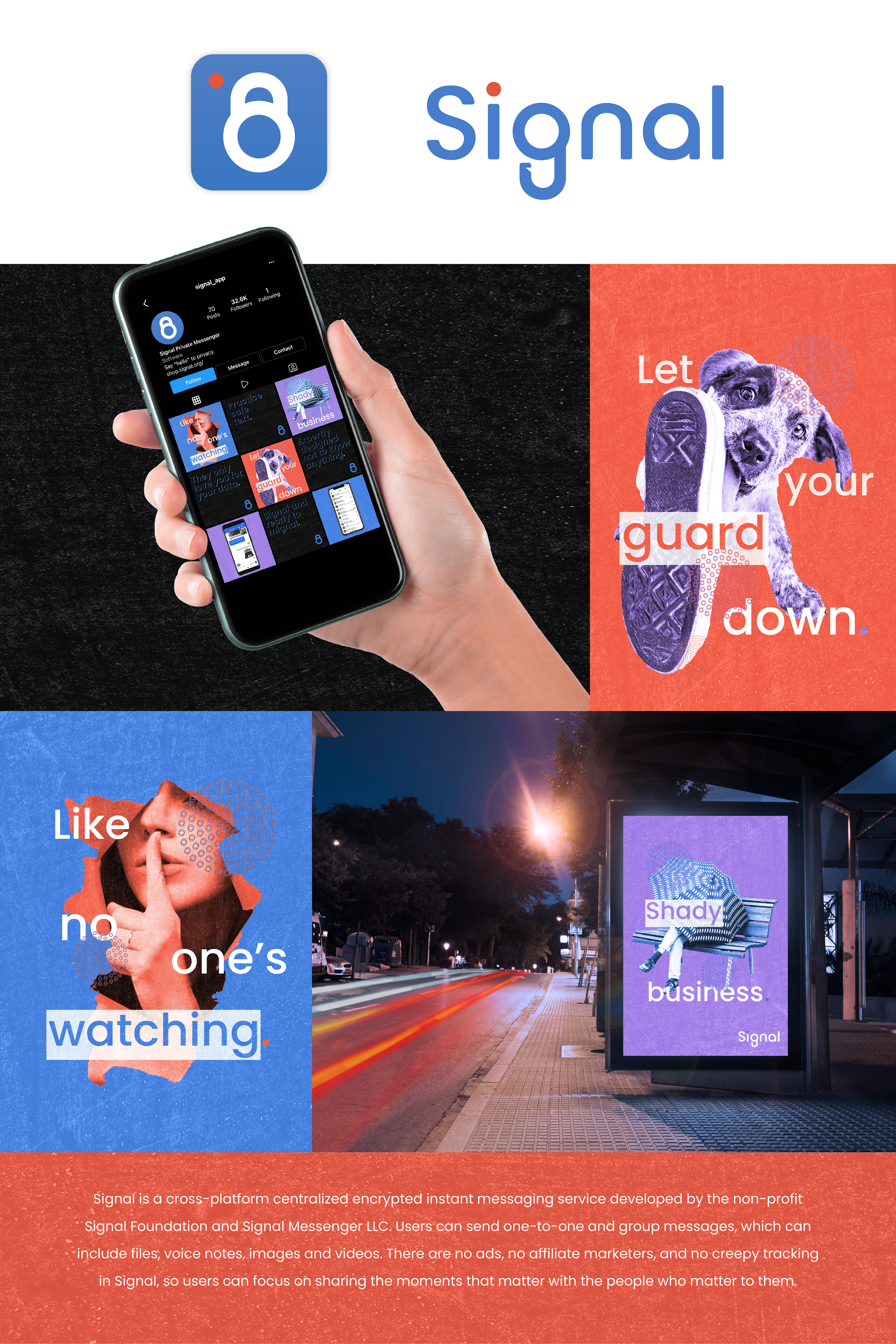 Signal is a real, open-source, encrypted messaging service I was assigned as part of a rebrand & advertising campaign. The project included a logo & app icon redesign as well as a few unique ad concepts & mockups.