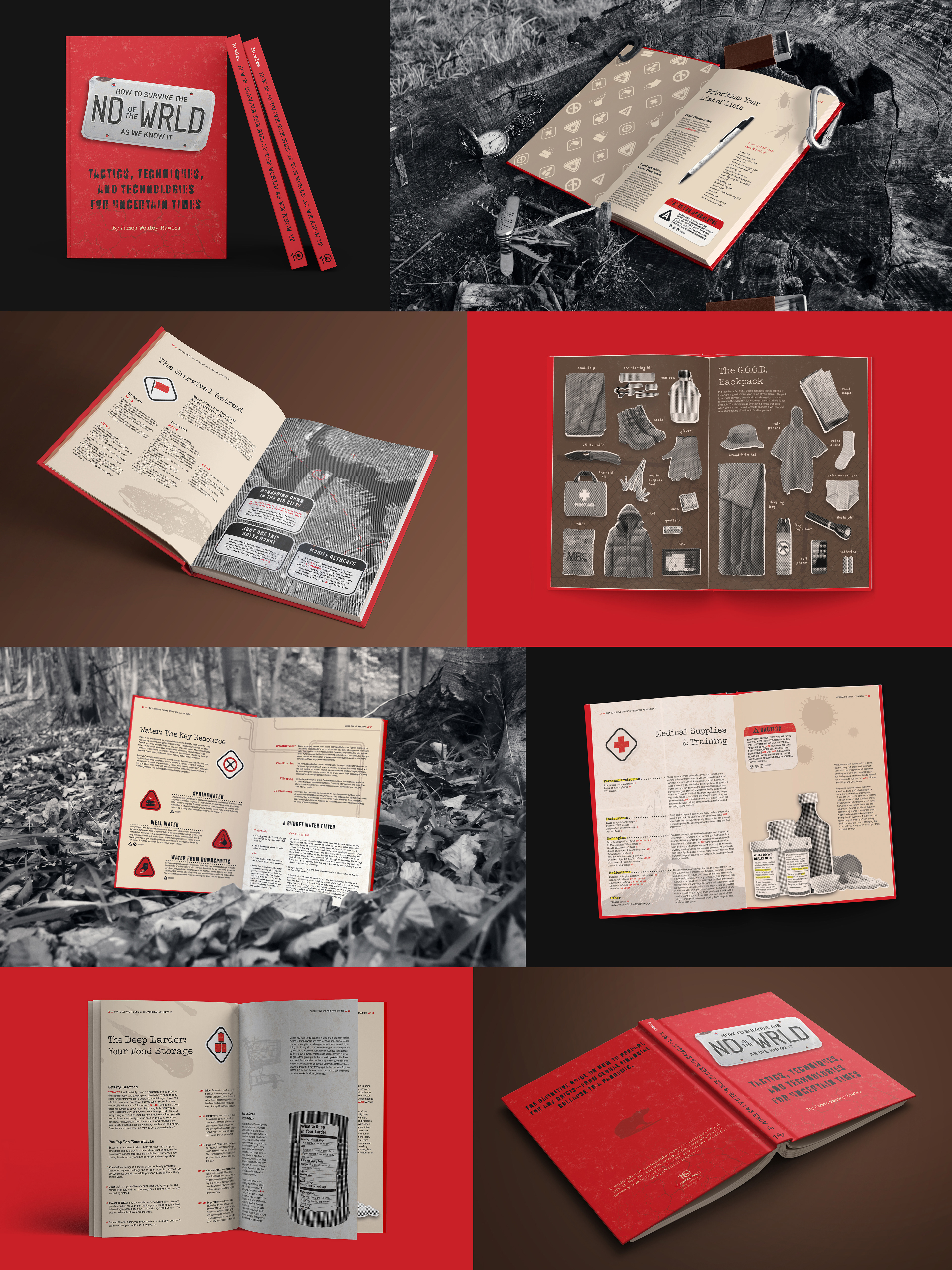 How to Survive the End of the World as We Know It is a real survival book by James Wesley Rawles. As part of my publication design class I chose to redesign it visually using real information from throughout the book. Below are the final mockups featuring all of my own original design work.